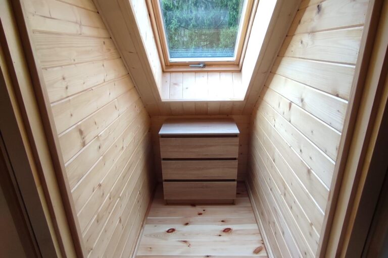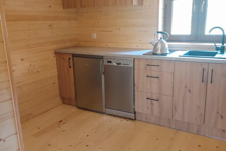 W domkach panuje ciepły i przytulny klimat charakterystyczny dla domków wykonanych z drewna, a dodatkowego uroku dodaje kominek, który znajduje się w salonie.